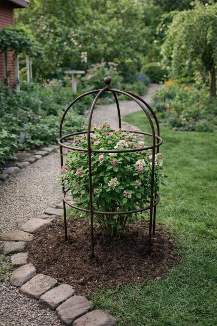 Металева стійка опора,що підтримує рослину під час росту, зберігає форму куща та додає декоративності саду.