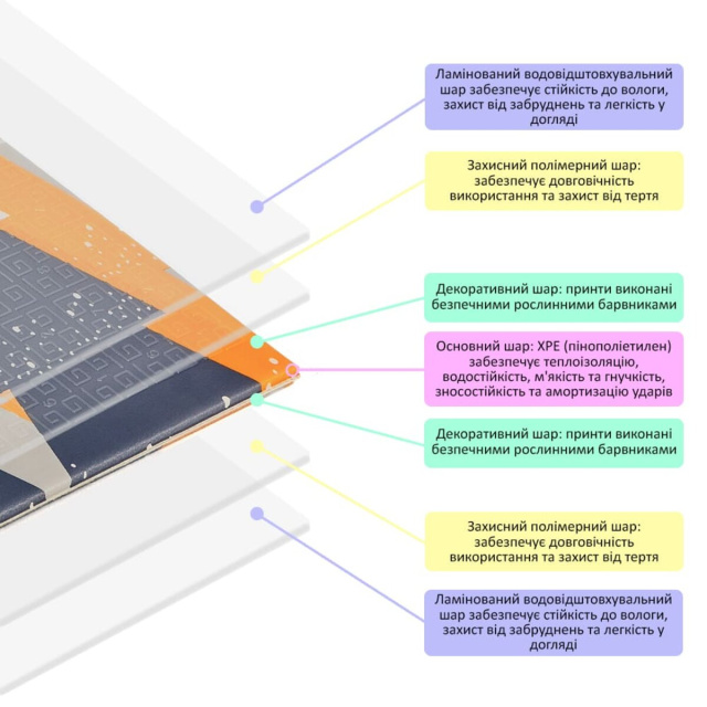 Основний матеріал килимка – спінений поліуретан (ХРЕ). Цей матеріал широко застосовується, він має термоізоляційний ефект, тобто не пропускає холод, а також не викликає алергію. Верхнє покриття килимка - харчова плівка, яка робить килимок вологостійким і захищає малюнок від зносу.
