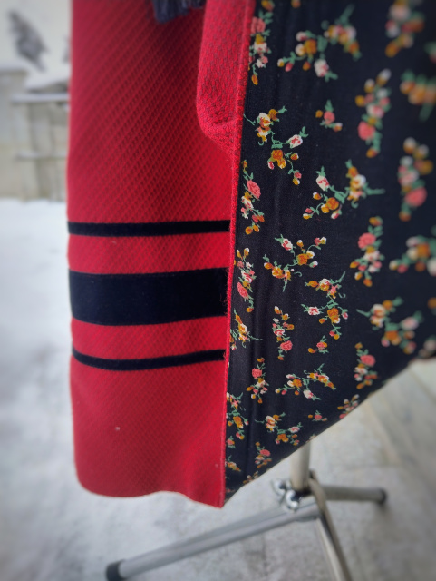 Спідничка з червоно-винного жаккарду. Оздоблена чорним оксамитом та квітковим підбоєм. Ширина в поясі регулюється.