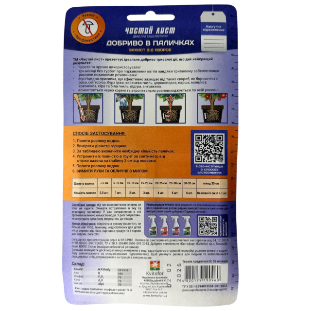 Удобрение в палочках, 20шт блистер «Чистый Лист» от болезней, Київська область
