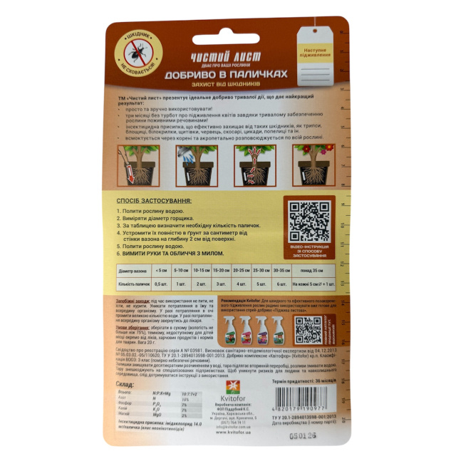 Удобрение в палочках, 20шт блистер «Чистый Лист» от вредителей, Київська область