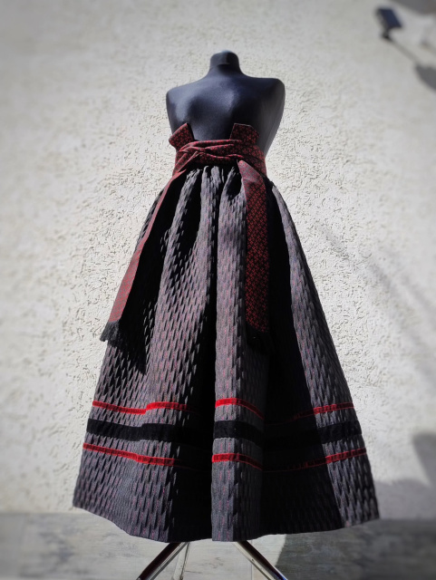 Спідничка чорно-бордового кольору з жаккардового полотна. Оздоблена оксамитом та бавовняним червоно-бордовим бавовняним підбоєм.