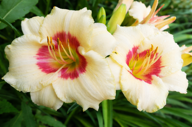 - Колір квітів: кремово-білий із бордовим оком